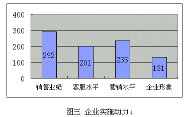 (d)提升企業(yè)形象:很多受訪企業(yè)特別是服務業(yè),已經建立客戶忠誠度放在了很重要的位置,但比較其它幾個直接動因,比例偏低,這也似乎說明"以客戶為中心"的觀念還沒有"以利潤為中心"強烈。