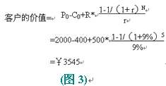 假設客戶與公司保持交易時間:N=5年;公司最初吸引每個客戶的成本(營銷費用): C0=¥400;客戶第一次購買的產品價格:P0=¥2000;公司期望每年從每個客戶處增加的收入:R=¥500;利率(一般指貸款利率): r =9%;那么客戶的價值等于:客戶初次購買產品和以后幾年每年消費價值的折現(xiàn)之和,減營銷成本,即: