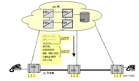 如下圖所示,當(dāng)一個(gè)用戶(hù)摘機(jī)并拔被叫號(hào)碼,交換局(SSP1)收集并分析被叫號(hào)碼,分析到被叫不是本局內(nèi)用戶(hù),而是目的信令點(diǎn)編碼為1.1.3交換局的用戶(hù),于是,SSP1在路由表中查找到達(dá)1.1.3的路由,然后用找到的鏈路把IAM消息發(fā)送出去,如圖中箭頭所示。
