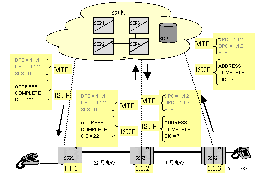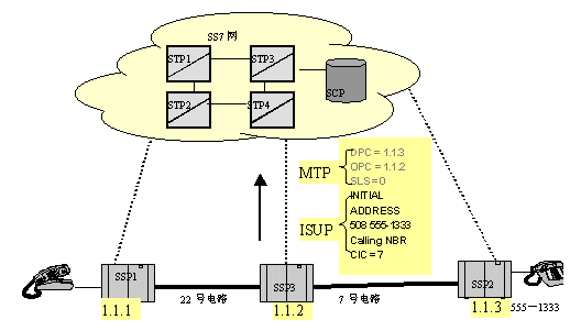 當(dāng)消息(IAM)到達(dá)路由中下一個(gè)交換點(diǎn)1.1.2時(shí),MTP層再次分析路由。在1.1.2中,MTP查找目的信令點(diǎn)編碼,并發(fā)現(xiàn):這個(gè)消息不是發(fā)給自己的,然后就找出轉(zhuǎn)發(fā)這個(gè)消息的路由及具體的鏈路。