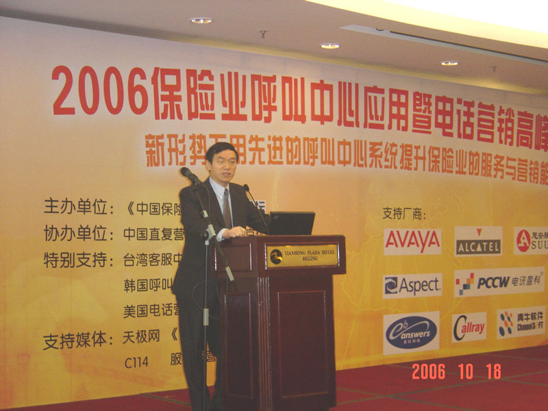。。2006年10月18日,2006保險(xiǎn)業(yè)呼叫中心應(yīng)用暨電話營銷高峰研討會(huì)在北京天鴻科園大酒店隆重召開,以下是大會(huì)開幕致辭的相關(guān)圖片報(bào)道: