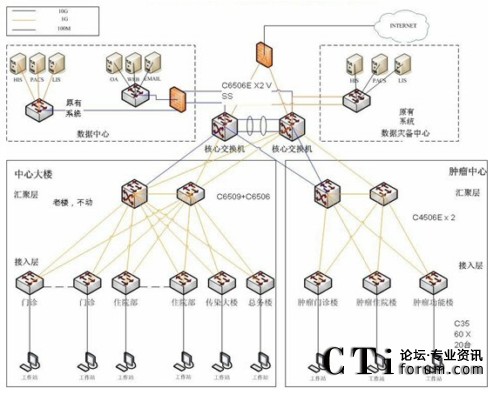 4506E作為新腫瘤大樓的匯聚層和整個醫(yī)院的小災(zāi)備中心,并上連至核心交換機以節(jié)約投資成本,而接入層繼續(xù)采用思科Catalyst 3560交換機,既方便了管理,也為日后無線網(wǎng)絡(luò)的部署作好了準備。(網(wǎng)絡(luò)拓撲圖如下)