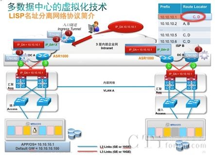 對(duì)于LISP解決了遠(yuǎn)程訪問數(shù)據(jù)中心遷移后虛機(jī)的精確位置問題,LISP需要數(shù)據(jù)中心和遠(yuǎn)程的路由設(shè)備都要支持,但不需要中間網(wǎng)絡(luò)的每一條網(wǎng)絡(luò)設(shè)備都支持,這一點(diǎn)非常重要。