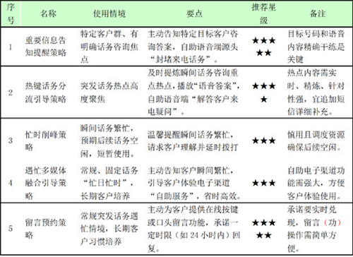 。1)策略內(nèi)容:突發(fā)話務(wù)往往導致瞬間話務(wù)高峰,如能將瞬間話務(wù)“均衡化”,則可有效避免“話務(wù)雪崩”,為此通過錄制IVR語音,引導客戶閑時再撥!臼纠俊白鹁吹目蛻簦壳叭斯ぴ拕(wù)繁忙,為節(jié)省您的時間,建議您4小時后再行撥打。給您帶來不便,我們深表歉意”。