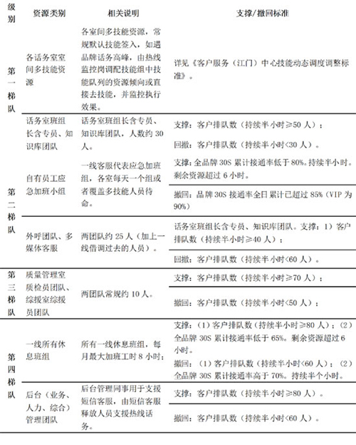 第一梯隊:側(cè)重現(xiàn)有話務(wù)科室間“技能協(xié)同”,適度放棄某些品牌,重點保障某品牌;同時一線班組長和日常負責業(yè)務(wù)知識管理的同事入線,承接普通話務(wù)。