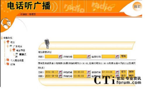定制自動(dòng)聽廣播的目的是:用戶設(shè)定的時(shí)間到達(dá)時(shí),由系統(tǒng)主動(dòng)呼叫用戶所定制的電話,用戶摘機(jī)即可收聽到所定制的廣播節(jié)目?jī)?nèi)容。用戶要獲取該自動(dòng)服務(wù)的前提是,必須預(yù)先定制好外呼時(shí)間、外呼電話和廣播內(nèi)容。