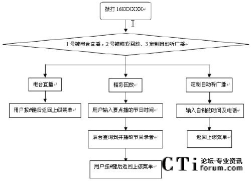 用戶使用時(shí)可通過固定話機(jī)、小靈通或手機(jī)撥叫業(yè)務(wù)特號(hào)進(jìn)入系統(tǒng),根據(jù)系統(tǒng)的語音提示按鍵選擇收聽不同的電臺(tái)節(jié)目,在收聽廣播的過程中,可按下電話機(jī)上的#字鍵返回上級(jí)菜單提示音,以滿足用戶在收音過程中需要不斷調(diào)換頻道的要求。