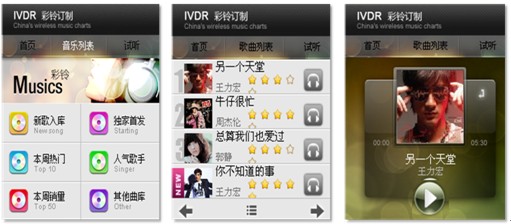 6)彩鈴定制業(yè)務(wù)。傳統(tǒng)彩鈴定制業(yè)務(wù)基于純語音IVR的環(huán)境下使用起來非常繁瑣,進行彩鈴檢索比較麻煩,選擇的準(zhǔn)確度也很低。手機客戶端軟件的應(yīng)用,提供了可視化的交互方式,讓業(yè)務(wù)使用起來直觀便捷很多。用戶通過聲動魅力完成彩鈴信息的瀏覽、試聽、定制過程,用戶可以邊瀏歌曲的同時邊聽到語音對歌曲的介紹,并可試用該歌曲。下圖即為彩鈴定制業(yè)務(wù)操作界面: