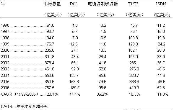 根據(jù) Frost & Sullivan 的預(yù)測(cè), 從1999年到2006年,美國(guó)寬帶接入服務(wù)市場(chǎng)的年平均復(fù)合增長(zhǎng)率為23.1%。預(yù)計(jì)在2006年, 美國(guó)寬帶接入服務(wù)的市場(chǎng)總額將高達(dá)757.5億美元。 其中DSL接入服務(wù)的增長(zhǎng)幅度最大,年平均復(fù)合增長(zhǎng)率高達(dá)47.4%,而DSL市場(chǎng)總額將增長(zhǎng)為189.7億美元,占整個(gè)市場(chǎng)的26.2%。 電纜調(diào)制解調(diào)器服務(wù)市場(chǎng)的年平均復(fù)合增長(zhǎng)率也將高達(dá)36.2%,市場(chǎng)規(guī)模將達(dá)到95.6億美元,占整個(gè)寬帶接入市場(chǎng)的12.6% 。而T1/T3數(shù)據(jù)接入專線由于其技術(shù)成熟,在企業(yè)用戶中接受度頗高,它的年平均復(fù)合增長(zhǎng)率預(yù)計(jì)約為18.3%,市場(chǎng)總額將增至419.3億美元,在整個(gè)寬帶接入市場(chǎng)中還是處于統(tǒng)治地位,占整個(gè)市場(chǎng)的55.3%。 而ISDN接入服務(wù)的增長(zhǎng)則較為緩慢,年平均復(fù)合增長(zhǎng)率將僅為11.8%,市場(chǎng)規(guī)模約是52.3億美元,占整個(gè)寬帶接入市場(chǎng)的5.9%。