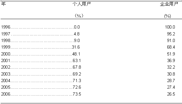 圖三表示出美國(guó)DSL市場(chǎng)企業(yè)和個(gè)人用戶所占的比例。在1999年以前,企業(yè)用戶占了這個(gè)市場(chǎng)的絕大部分,這一時(shí)期服務(wù)商提供的主要是針對(duì)企業(yè)用戶的HDSL服務(wù)。而從1999年以后隨著ADSL技術(shù)的成熟和普及,個(gè)人用戶正在成為市場(chǎng)上的主力軍。1999年,個(gè)人DSL用戶僅占總用戶數(shù)的31.6%, 企業(yè)用戶,主要是中小企業(yè)用戶占DSL總用戶數(shù)的68.4%。而到了2000年,美國(guó)市場(chǎng)上48.1%的DSL用戶為家庭用戶,企業(yè)用戶的比例下降為51.9%。Frost & Sullivan預(yù)測(cè),到2006年,73.5%的DSL用戶將是個(gè)人家庭用戶,企業(yè)用戶將僅為26.5%。