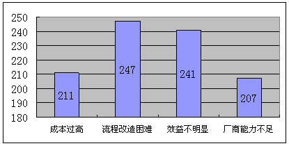 b)流程改造困難,對這個困難的擔心的企業(yè)數(shù)量最多,考慮到國內(nèi)企業(yè)的現(xiàn)實管理問題,流程改造必然與現(xiàn)實的利益發(fā)生矛盾,引起的阻力不可輕視。