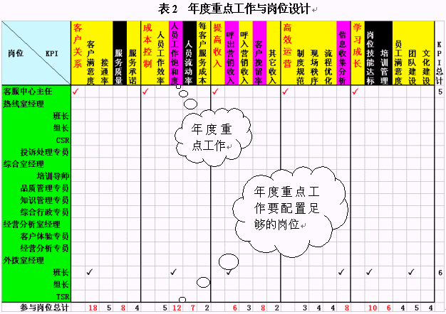在這里,我們先以崗位設(shè)計(jì)來舉例。經(jīng)常有呼叫中心主管把每個崗位的職責(zé)都設(shè)計(jì)的非常詳細(xì),包括了每天來做什么,說什么,錄入什么,甚至是打掃某區(qū)域衛(wèi)生之類。但是,我看遍了每一條,也沒找到這個崗位應(yīng)該對什么業(yè)績"負(fù)責(zé)任",該對哪些工作做出貢獻(xiàn)。此處建議各位把效益評價體系、年度重點(diǎn)工作與崗位設(shè)計(jì)結(jié)合起來。如表2所示,我們可以把效益評價體系作為KPI放在橫坐標(biāo)中,而崗位設(shè)置則是縱坐標(biāo)。每個崗位對應(yīng)的行中,可以勾畫其應(yīng)負(fù)責(zé)或者做出主要貢獻(xiàn)的項(xiàng)目。這些項(xiàng)目不能超過6個,因?yàn)樘嗟捻?xiàng)目會使得這個崗位無所適從,最終的結(jié)果是哪個也沒做好。當(dāng)你勾畫完成之后,請計(jì)算每列的"對勾"數(shù)目,看看你本年度的重點(diǎn)工作是不是有較多崗位負(fù)責(zé)呢?