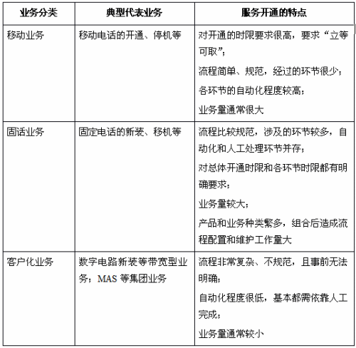 同時(shí)全業(yè)務(wù)運(yùn)營(yíng)也帶來(lái)了許多新的服務(wù)開(kāi)通方面的需求。首先,全業(yè)務(wù)運(yùn)營(yíng)環(huán)境下,運(yùn)營(yíng)商為了更快地占領(lǐng)市場(chǎng)和吸引客戶,會(huì)推出大量的套餐和捆綁組合產(chǎn)品,這就會(huì)引發(fā)流程和環(huán)節(jié)同步的需求,包括多個(gè)環(huán)節(jié)同時(shí)開(kāi)始、同時(shí)結(jié)束、串行等。例如開(kāi)通一個(gè)同時(shí)包含固定電話、移動(dòng)電話的產(chǎn)品包,要求固定電話與移動(dòng)電話可同時(shí)施工、同時(shí)竣工。此外,套餐和捆綁組合產(chǎn)品對(duì)環(huán)節(jié)級(jí)別也存在協(xié)同需求,例如常見(jiàn)的電話與ADSL開(kāi)通,由于電話與ADSL在技術(shù)實(shí)現(xiàn)上共用線路,因此這兩個(gè)開(kāi)通流程裝機(jī)環(huán)節(jié)需要協(xié)同配合,允許兩個(gè)流程同時(shí)開(kāi)始。此外,隨著增值業(yè)務(wù)的大量涌現(xiàn),由于增值業(yè)務(wù)的數(shù)量眾多,會(huì)給維護(hù)人員帶來(lái)大量的流程配置工作。例如,客戶在申請(qǐng)裝機(jī)時(shí)可同時(shí)申請(qǐng)開(kāi)通很多增值業(yè)務(wù),不同增值業(yè)務(wù)可能由不同的業(yè)務(wù)平臺(tái)支持,需要到不同的業(yè)務(wù)平臺(tái)進(jìn)行施工,裝機(jī)流程的配置需支持眾多環(huán)節(jié),且日后會(huì)面臨增加新業(yè)務(wù)時(shí)大量的修改工作量。