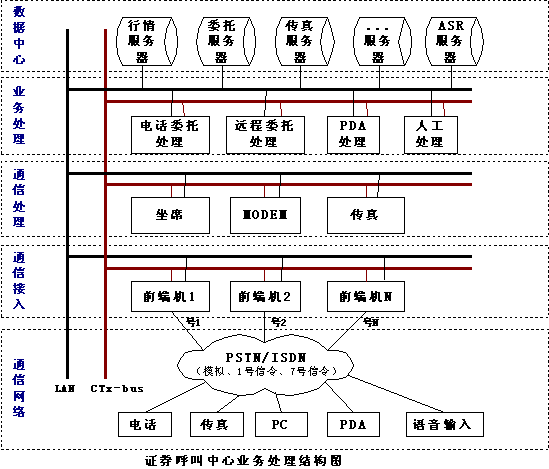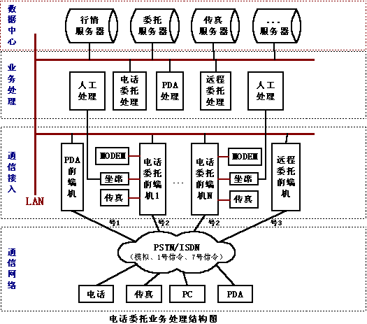 另一種方案是PDA和證券營業(yè)部前端機(jī)(實(shí)際就是電話委托前端機(jī))采用FSK通訊方式,使用電話委托的通道來完成所有的委托查詢。這種方式的速度快,信息容量大,保密性強(qiáng),而且營業(yè)部不需單獨(dú)申請電話線路,PDA和電話委托線路可動態(tài)分配,使其電話線路得到最大限度的利用。另外,營業(yè)部對外形象也好,只用一個(gè)號碼就可讓股民完成電話委托、PDA委托等多種委托方式,給股民帶來了方便。不過這種方式需要得到電話語音卡提供廠商的產(chǎn)品技術(shù)支持,語音卡必須同時(shí)支持標(biāo)準(zhǔn)的DTMF和FSK的方式,卡上有充足的能力來處理兩種方式,在語音處理卡的底層驅(qū)動應(yīng)該將電話和PDA的委托區(qū)別開來,目前市場能夠完全支持這種應(yīng)用的只有深圳市東進(jìn)通訊技術(shù)股份有限公司的產(chǎn)品,東進(jìn)技術(shù)的新一代PCI系列語音卡數(shù)字卡和模擬卡都完全采用DSP(數(shù)字信號處理器)架構(gòu),卡上有專用DSP來處理DTMF和FSK的收發(fā),是目前PDA委托前端的最好選擇;這種方案還應(yīng)該得到證券電話委托系統(tǒng)的開發(fā)商的支持,在電話委托系統(tǒng)里增加處理PDA委托的功能。目前恒基偉業(yè)的“股靈通”就是采用這種方式。