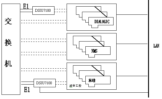 電信企業(yè)已有的112、114、170、189、180等系統(tǒng),這些系統(tǒng)的硬件設(shè)備各成體系,很可能由不同廠家的板卡組成:DIALOGIC、東進(jìn)、NMS,或其他品牌;還可能采用不同的信令方式:NO.1 信令、NO.7信令、 ISDN信令。如何把五花八門的系統(tǒng)集成起來,以有效利用、降低成本?東進(jìn)七號網(wǎng)關(guān)DSIU7100提供解決此問題的最好解決方案,系統(tǒng)可兼容不同廠家生產(chǎn)的不同數(shù)字中繼接口的語音板卡,最大限度的利用原有資源,結(jié)構(gòu)如下圖所示: