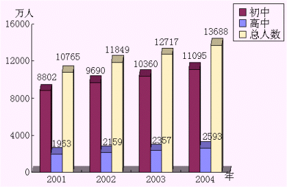 2001年,中國大陸中學學生人數已達10765萬人,而且學生人數還在快速增長。初中學生人數以每年6.5%的速度增長,普通高中學生人數也以每年10%-11%的速度增長。可以看出,教育市場巨大的潛力和商機。