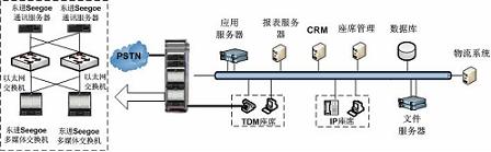 系統(tǒng)整體采用集中式架構,呼叫中心平臺采用東進公司基于Yessoe技術開發(fā)的Seegoe多媒體交換機和Seegoe通信服務器。呼叫中心平臺與物流公司內(nèi)部的物流管理系統(tǒng)(如LM、SCM)通過TCP/IP進行結合。呼叫中心系統(tǒng)具有豐富的媒體資源和強大的處理能力,并提供功能模塊的N+1全冗余備份,滿足了高負荷、大并發(fā)和關鍵業(yè)務的可靠運營。其次,Seegoe呼叫中心平臺在媒體交換層以全新的IP架構實現(xiàn)網(wǎng)絡融合、應用融合和業(yè)務融合,能夠很好的滿足電視購物行業(yè)對呼叫中心的要求。