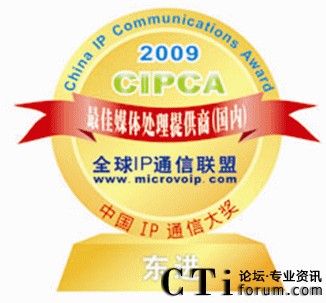 代表國內(nèi)IP通信領(lǐng)域最高水準的中國IP通信大獎(CIPCA),于2009年9月25日在上海NexCom Expo 下一代網(wǎng)絡(luò)通信展暨CIPCC中國IP通信大會上揭曉。深圳市東進技術(shù)繼2008年獲得此項殊榮后,憑借無可爭議的票數(shù)優(yōu)勢,蟬聯(lián)“2009中國IP通信大獎”,取得“最佳媒體處理提供商(國內(nèi))”獎項。