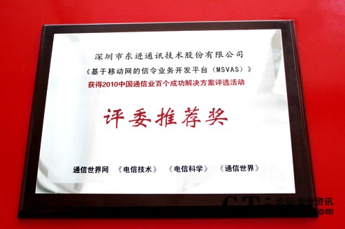 從2010年7月起評(píng)選進(jìn)入征集階段,經(jīng)過(guò)長(zhǎng)達(dá)3個(gè)月的層層篩選,最終百個(gè)成功解決方案出爐,并由多家主流媒體公示。東進(jìn)技術(shù)“基于移動(dòng)網(wǎng)的信令業(yè)務(wù)開(kāi)發(fā)平臺(tái)(MSVAS)”解決方案憑借出眾的實(shí)用經(jīng)濟(jì)性、安全可靠性、靈活性和成熟性,經(jīng)過(guò)兩個(gè)月網(wǎng)絡(luò)初選,和近百位運(yùn)營(yíng)商層面專(zhuān)業(yè)人士組成的組委會(huì)技術(shù)終選后獲此殊榮。