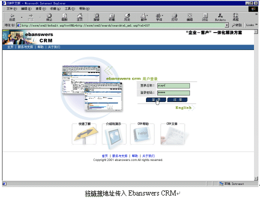 Ebanswers CRM系統(tǒng)去激活相關客戶資料的IE頁面進行處理:如果此號碼數(shù)據(jù)庫中存在,則顯示此人的信息,如果不存在,則顯示CRM中添加新線索的頁面。而Ebanswers
