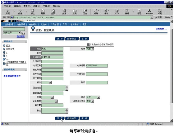 。。比如現(xiàn)在有一個新客戶黃航的電話13082856110呼入Ebanswers呼叫中心,console控制臺接收到這個電話號碼以后,會產(chǎn)生一個URL鏈接地址tel=217,以參數(shù)的形式附在調(diào)用的CRM頁面http://ecrm/crm2/default.asp?retURL=http://ecrm/crm2/search/searchtel_xml.asp后面,當話務員登錄以后,就會彈出相應的添加新線索頁面,話務員填寫好相關信息后,按下"保存"按鈕就可以建立新線索了。