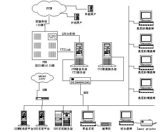 在整個系統(tǒng)中北京聯(lián)訊創(chuàng)新公司承擔了奧星天網(wǎng)GPS信息服務(wù)系統(tǒng)的呼叫中心系統(tǒng)(CALL CENTER)的籌建。