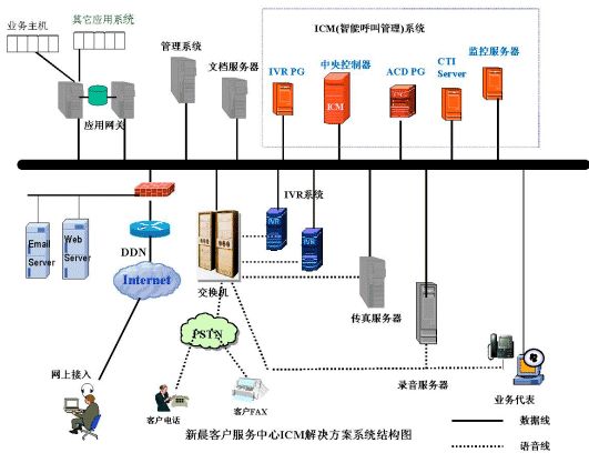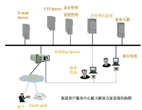 新晨客戶服務(wù)中心普及型解決方案是在以專用交換機(jī)或PC服務(wù)器加語音卡作為電話接入設(shè)備,如果用PC服務(wù)器加語音卡作為電話接入設(shè)備,將電話中繼線直接接到IVR上。此方案中的CTI系統(tǒng)能夠適用于流行的語音板卡和多種電話交換機(jī)的不同環(huán)境,這種解決方案主要針對小型的客戶服務(wù)中心推出。