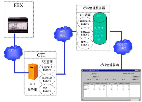 一般來(lái)說(shuō),各大有能力推出PBX產(chǎn)品的通訊廠商都有自己專用的呼叫管理系統(tǒng)。這些專用的呼叫管理系統(tǒng)可以直接從PBX獲取最高效的消息,而不用通過(guò)CTI SERVER。當(dāng)然,這些專用的呼叫管理系統(tǒng)也只能應(yīng)用于專門的PBX產(chǎn)品。 如果運(yùn)營(yíng)商在選購(gòu)設(shè)備的時(shí)候,已經(jīng)選購(gòu)了專用的呼叫管理系統(tǒng),那么開發(fā)商可以對(duì)這個(gè)專門的呼叫管理系統(tǒng)進(jìn)行二次開發(fā)。請(qǐng)看下面的數(shù)據(jù)流程圖: