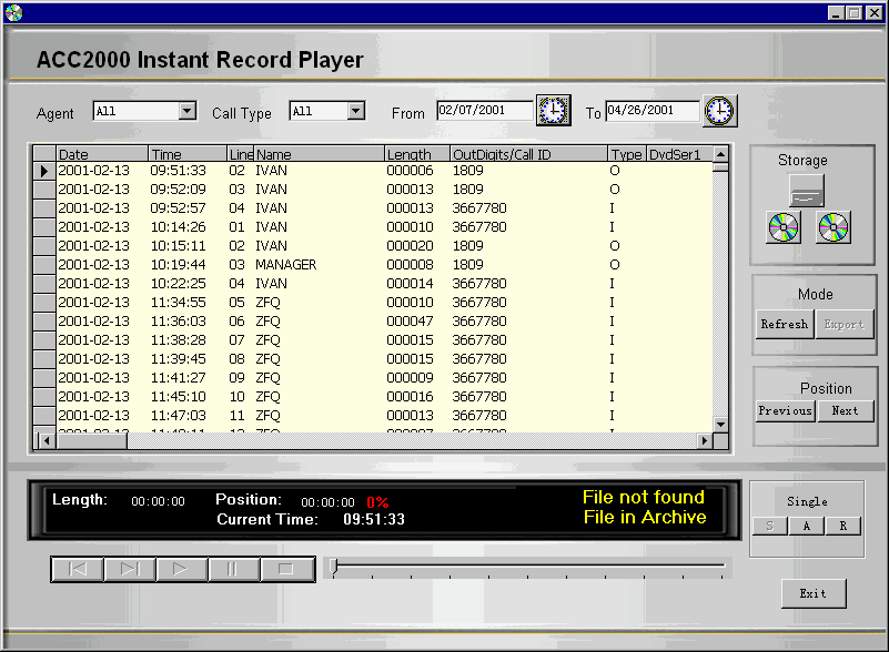 ACC2000 多媒體溝通中心采用最先進(jìn)的海量存儲(chǔ)設(shè)備DVD RAM構(gòu)建實(shí)時(shí)多通道語(yǔ)音錄制、備份系統(tǒng)��ACC2000 DVD Record Backup。這個(gè)系統(tǒng)可以根據(jù)管理員設(shè)定的錄音對(duì)象,對(duì)符合錄音條件的通話自動(dòng)進(jìn)行錄音。