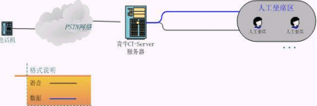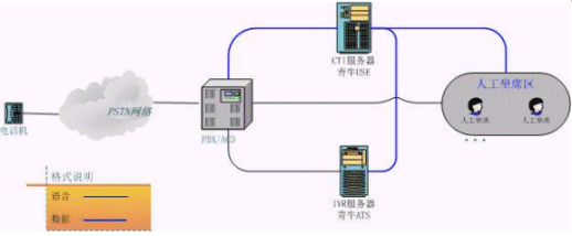 上圖是客服中心較常見的結構圖,相當于將初級客服的CT-Server服務器一分為三。原來的語音板卡由現在真正的PBX替代,青牛USE和青牛ATS則是從CT-Server軟件包中獨立出來,強化各自的核心功能,運行在兩臺單獨的服務器上(IVR服務器還是需要語音板卡來處理話路,但語音板卡已經不負責PBX的交換功能了)。這種類型的客服中心可以給客戶更大規(guī)模的、更穩(wěn)定的服務,并且撥入電話的客戶感覺不到系統的變化。
