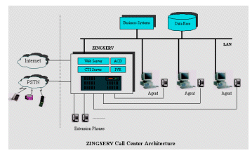 ZINGSERVò采用可靠性、安全性極高的嵌入式實時LINUX操作系統(tǒng)進(jìn)行開發(fā)。系統(tǒng)軟件采用客戶/服務(wù)器結(jié)構(gòu),服務(wù)器集ACD(技能組)、IVR、CTI