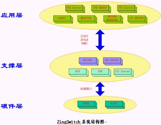 在以上三層結(jié)構(gòu)中,前兩層與具體業(yè)務(wù)系統(tǒng)無關(guān)。上層業(yè)務(wù)系統(tǒng)的多種變化,不會(huì)影響下層的穩(wěn)定;而下層規(guī)范地進(jìn)行優(yōu)化和擴(kuò)展后,上層的所有應(yīng)用都可在業(yè)務(wù)功能上得到擴(kuò)展。這樣,用戶的業(yè)務(wù)應(yīng)用系統(tǒng)自身可以有多種功能和性能的變動(dòng)和擴(kuò)展,同時(shí),當(dāng)基于ZingSwitch一體化交換機(jī)的呼叫中心系統(tǒng)平臺(tái)在進(jìn)行擴(kuò)容、升級的時(shí)候,原來已經(jīng)無縫掛接其上的用戶的業(yè)務(wù)應(yīng)用系統(tǒng)也無需任何更改即可運(yùn)行。