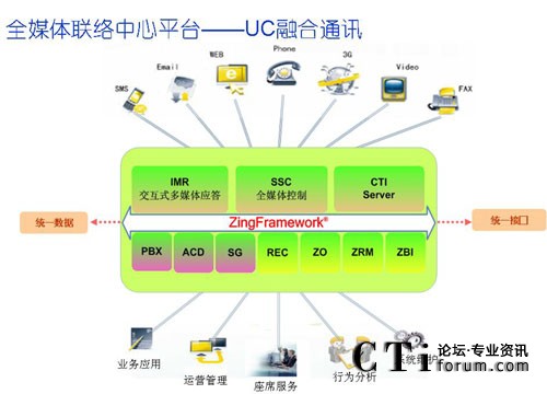 英立訊公司ZingFramework®®全媒體聯(lián)絡中心平臺基于H.323和SIP等國際標準協(xié)議,通過SOA服務架構(gòu)實現(xiàn)聯(lián)絡中心的優(yōu)化計算,為客戶應用提供了多媒體服務處理能力,支持固話、手機、傳真、郵件、短信、互聯(lián)網(wǎng)和Web電話等多種通信方式的接入,以及3G視頻互動和RFID物聯(lián)應用,實現(xiàn)多種服務媒體和通訊渠道的統(tǒng)一融合,并提供統(tǒng)一接入、統(tǒng)一路由、統(tǒng)一排隊、統(tǒng)一服務、統(tǒng)一處理和回復的的綜合融合通訊服務平臺。