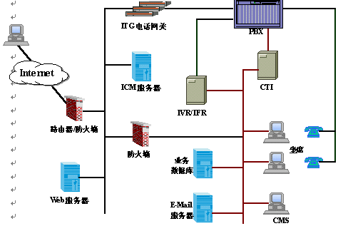 AllCom ICC呼叫中心采用開放的和可擴展的體系結構,通過高度靈活的系統(tǒng)平臺,為客戶提供Internet多媒體的接入方式。圖中右側是傳統(tǒng)呼叫中心部分,左側為Internet呼叫中心所特有的,其中關鍵部件為Internet呼叫管理(ICM)和IP電話網關(ITG)。