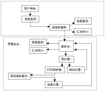 維修點(diǎn)對(duì)用戶的報(bào)修情況進(jìn)行預(yù)處理之后,根據(jù)用戶所在的區(qū)域,分配至最近距離的維修站,將用戶與其報(bào)修信息即時(shí)轉(zhuǎn)移,這也就是圖中所顯示的"轉(zhuǎn)站處理"。之后,維修站將直接打印出報(bào)修單,加快服務(wù)實(shí)施的效率、減少人工出錯(cuò)的比例,有專業(yè)人員及時(shí)上門(mén)服務(wù)檢修。