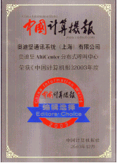 奧迪堅基于IP分布式呼叫中心平臺榮獲中國計算機報2003年度編輯推薦獎!吨袊嬎銠C報》(CIW-China