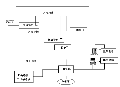 所謂的PC方式就是計算機+語音板卡,即在微機平臺上集成各種功能的資源處理卡,完成通信接口、語音處理、傳真處理、座席轉接等功能,再結合外部的計算機網(wǎng)絡實現(xiàn)各種應用系統(tǒng)的需求。整個系統(tǒng)是一個Client/Server結構的微機網(wǎng)絡。