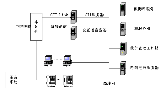 ACD方式即前置交換機+語音服務器,即在專用交換機+ACD(自動話務分配)的基礎上擴展功能,用CTI技術實現(xiàn)通信和計算機的功能結合,并配以必要的語音和數(shù)據(jù)庫系統(tǒng)。