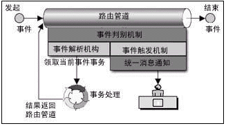 在路由管道中流轉(zhuǎn)著加載了業(yè)務的工作流事件。事件按照事先定義的路由規(guī)則流轉(zhuǎn),事件的路由規(guī)則定義了事件在路由管道中可以停靠的“站臺”,同時定義了事件到達“站臺”時可以領取并處理加載在事件上的業(yè)務的角色。事件從始發(fā)站臺進入路由管道,經(jīng)過一個或多個中間站臺,最后到達終點站。事件每?恳粋站臺,相關人員領取事務,并進行處理后重新裝載事務,觸發(fā)事件向下一個站臺流轉(zhuǎn),除非事件已經(jīng)到達終點站。