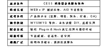 CESS消費(fèi)型服務(wù)軟件具有經(jīng)濟(jì)實(shí)惠、選擇多樣、簡(jiǎn)單快捷、配套自選、綠能環(huán)通路廣泛等特點(diǎn),采用Web+IP的潮流科技,AIO節(jié)省投資,使軟件經(jīng)濟(jì)實(shí)惠;CESS軟件產(chǎn)品線齊全,涵蓋客服、銷(xiāo)售、財(cái)務(wù)、行政、OA等很多方面,給您多樣選擇;WYSIWYG(所見(jiàn)即所得)導(dǎo)向,業(yè)務(wù)流程DIY,讓您至需要?jiǎng)觿?dòng)鼠標(biāo)就可以DIY您想要得到的設(shè)計(jì),不再需要麻煩IT人員,只管實(shí)用,簡(jiǎn)單快捷;輕松Plug-in & Hook其它應(yīng)用與通信環(huán)境,可根據(jù)您的需要配套自選;節(jié)能減碳、省話(huà)費(fèi)、省空間,綠色環(huán)保;經(jīng)銷(xiāo)體系健全、提供優(yōu)質(zhì)服務(wù),通路廣泛。
