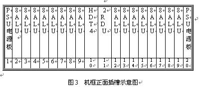 見圖2和3,遠端模塊采用19英寸標準機框,高度為5U,可安裝在各種標準的19英寸的機柜中。機框共20個插槽,正面插板,反面背板出線。每個機框可插20塊各種類型的板件,其中兩邊第1第20槽固定插電源板PSU,中間第10號槽固定插數字中繼接口板HDT4,其余16個槽為通用槽口,可插16塊各種類型接口板。每塊板為8路,一個機框總共128話路。調度接口板2RDU固定插第11槽,該板不占機框端口。對于自帶交換系統(tǒng),需要安裝一塊系統(tǒng)信號音板8TDU,該板固定插19槽,占8個端口。