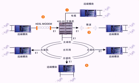 遠端模塊通過標準2M(E1)接口與交換機連接。該接口不受傳輸距離和傳輸設備的限制。常用的傳輸設備有SDH、PDH光端機(光纜),數字微波、數字擴頻,HDSL調制解調器(雙絞線)等。