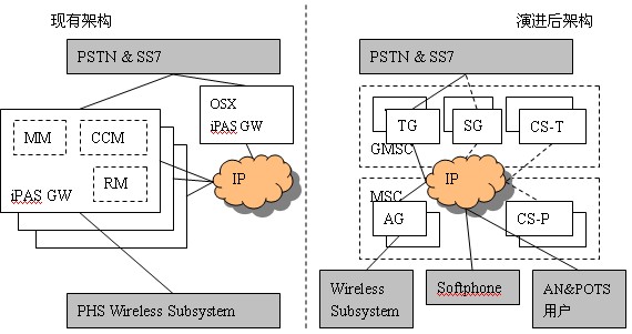 GW軟件改造而來,只需新增CS-P即可?偟膩碚f,核心網(wǎng)的演進只是增加CS-P、擴容CS-T、原有的iPAS GW軟件升級為TG/AG,就可以建立其一個具有多種終端接入能力的開放性多媒體VoIP移動軟交換網(wǎng)絡(luò),而原有的PHS系統(tǒng)功能又不會受到影響。
