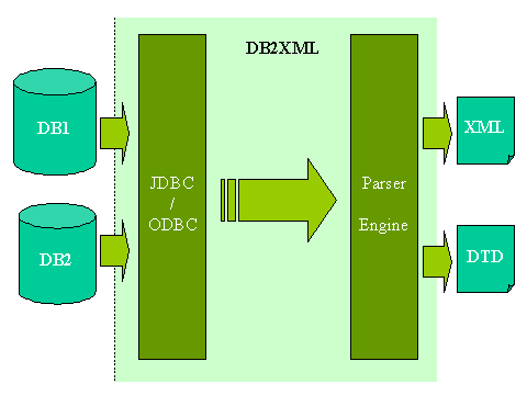 DB2XML中通過JDBC或JDBC-ODBC橋接各種現(xiàn)存的數(shù)據(jù)庫,訪問數(shù)據(jù)庫中的表;通過XML parser構(gòu)造出代表數(shù)據(jù)庫內(nèi)容的XML文件。DTD文件描述了從數(shù)據(jù)庫中的表到XML文件的對應關(guān)系。上圖描述了DB2XML的輸入輸出關(guān)系。事實上DB2XML是按照以下步驟完成轉(zhuǎn)化工作的: