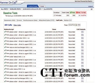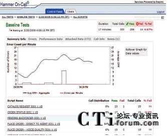 只需使用一個(gè)簡單易用的Web接入就可以和Empirix測試小組一起實(shí)時(shí)跟蹤測試進(jìn)度。此外,還同時(shí)可以查看測試結(jié)果、發(fā)生失敗的類型和導(dǎo)致失敗發(fā)生的測試流量。通話全程記錄功能可以用來記錄相關(guān)通話,從而捕獲和幫助診斷發(fā)生失敗的根源。可以參考下列圖表: