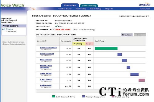 業(yè)務(wù)實(shí)時(shí)監(jiān)測:一旦呼叫成功連接,Voice Watch的業(yè)務(wù)實(shí)時(shí)監(jiān)測服務(wù)監(jiān)聽播放的語音提示,確保這個(gè)呼叫被路由到了正確的位置。業(yè)務(wù)實(shí)時(shí)監(jiān)測服務(wù)檢驗(yàn)線路的可用性、交換機(jī)性能、呼叫路由和起始的語音提示等。
