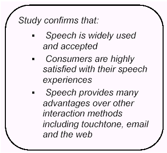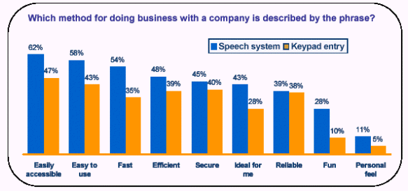此外,十個人中九個人認(rèn)為他們從使用語音服務(wù)中得到了在鍵盤式服務(wù)中得不到的價(jià)值不菲的好處,并有70%的人說如果語音服務(wù)系統(tǒng)取代了按鍵式系統(tǒng)的話,他們的效率也將得以提高。