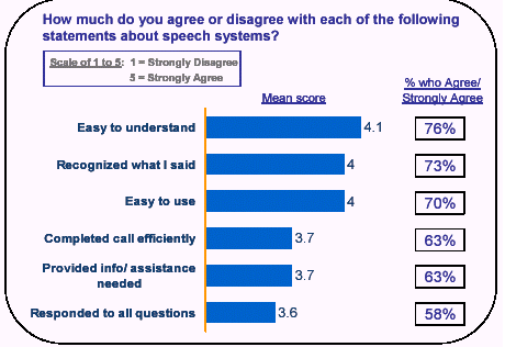被訪問者們例舉了語音系統(tǒng)的很多優(yōu)點(diǎn)。超過75%的人認(rèn)為語音服務(wù)方便易用,有三分之二的使用者說語音服務(wù)不僅為他們提供了準(zhǔn)確的信息同時也為他們節(jié)省了等待客戶服務(wù)員的時間。