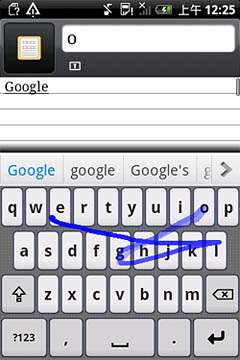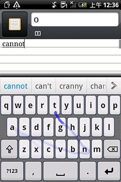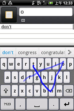 如圖所示,Nuance T9 Trace英文輸入方案對(duì)于各種不同的字母組合都能有效識(shí)別,像“google”這種既有連續(xù)又有間斷重復(fù)字母的單詞也不在話下,一次就能精準(zhǔn)輸出。另外,該輸入法還可以省去標(biāo)點(diǎn)符號(hào),如“don"t”“can"t”等單詞,用戶(hù)只需滑觸“d-o-n-t”這四個(gè)字母,輸入法就會(huì)自動(dòng)識(shí)別。