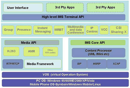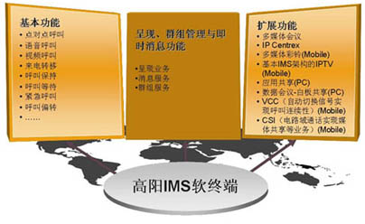 高陽IMS軟終端產品線是基于IMS(IP多媒體子系統(tǒng))技術,以通信終端功能為主,融入IT特性,將在線狀態(tài)、即時消息和群組管理融為一體,集合語音、數據、視頻通信,提供統(tǒng)一的用戶體驗,實現移動電話、PC之間的互聯互通,并且符合3GPP/ETSI/OMA/IETF/ITU-T等國際標準組織和中國電信/中國移動規(guī)定的IMS相關規(guī)范。